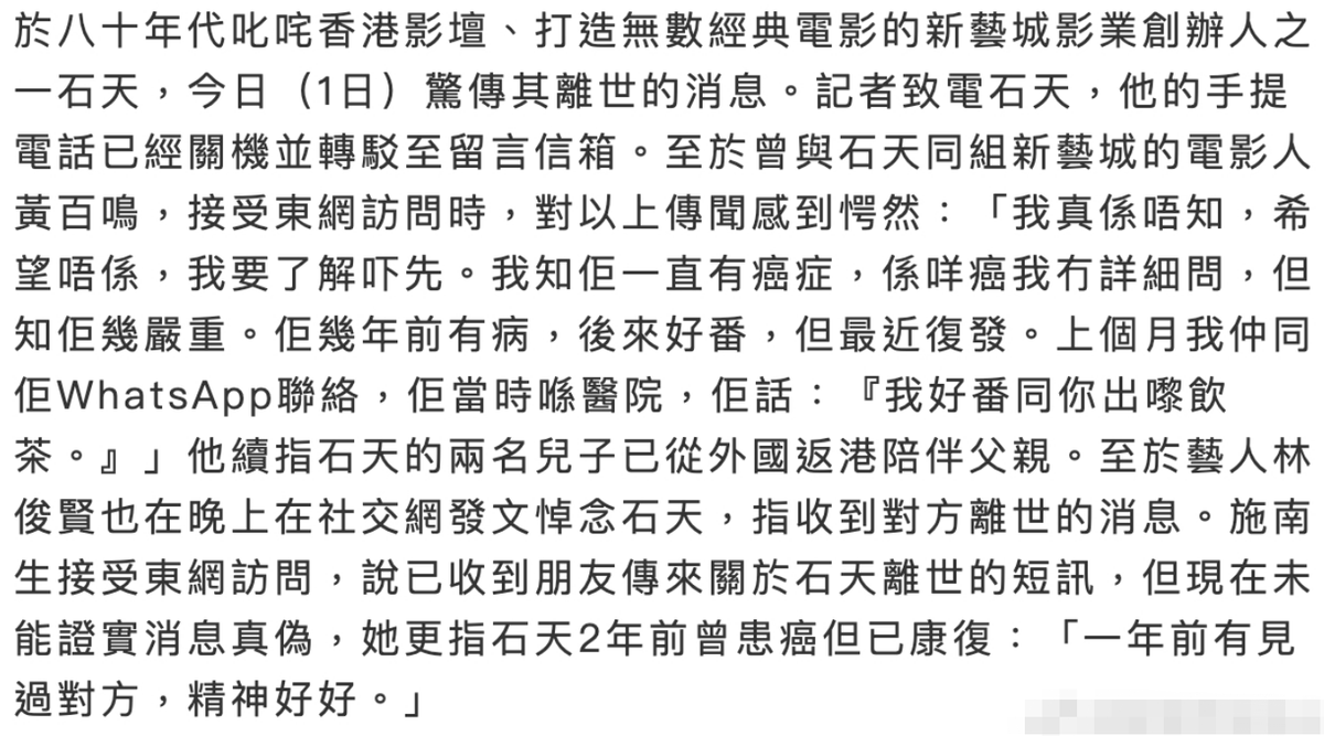 同时,石天的好友施南生也收到了媒体的询问电话,在沟通中得知,石天两年前也曾患癌,但已经康复,一年前见到他时,状态还不错,所以目前不敢确定消息真实性。可见石天的好友们对他这次突然离世都非常意外。