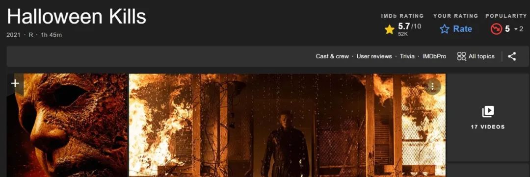 《月光光心慌慌》最新续集《杀戮》,严重翻车了!在美国某知名网站的评分,已经跌到了5.7分。如果有人说,惊悚片的及格线是5.5,好吧!《杀戮》在我国的某知名影评网站上只有5分。作为一部美国影迷充满情怀的系列续集,中国影迷给出的评分应该更加真实。