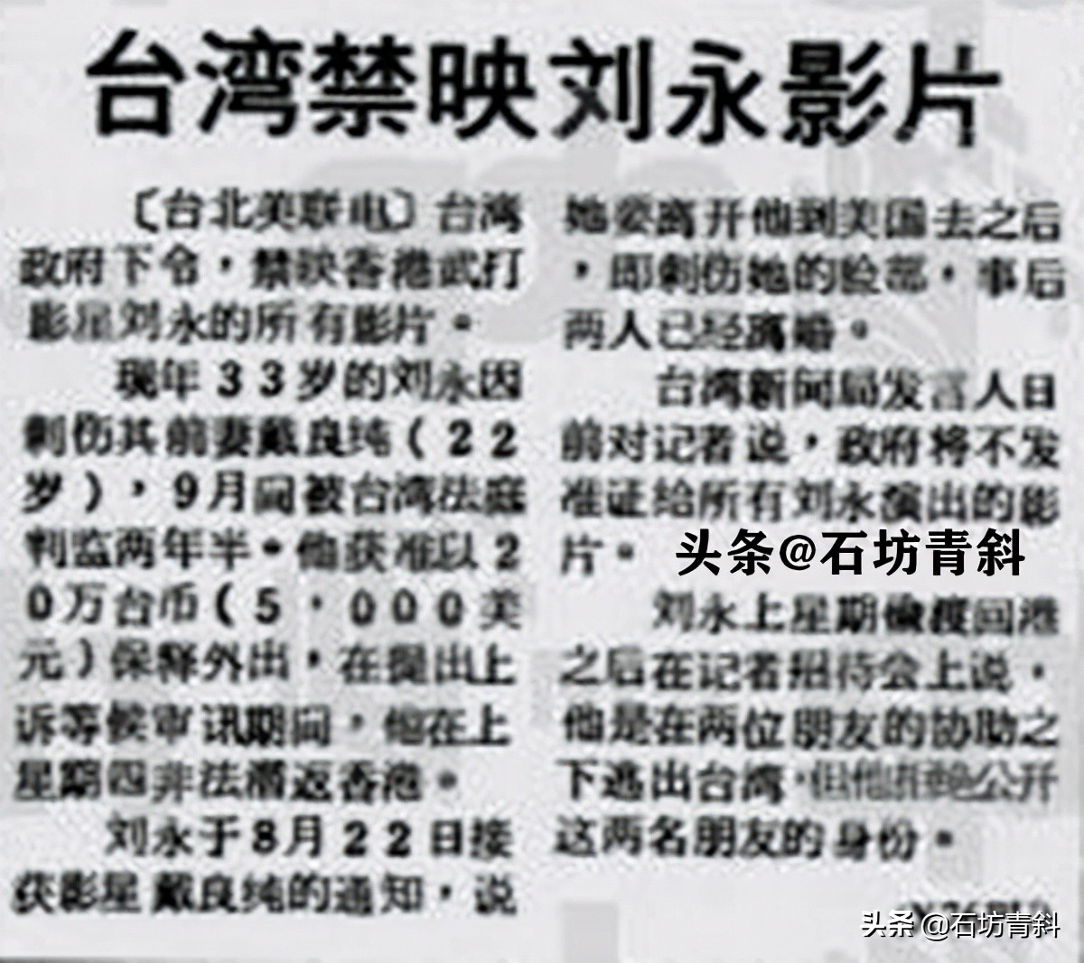 刘永刺伤前妻戴良纯之后,台湾当局一度禁止在台湾境内上映他的电影