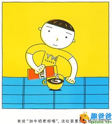 我说,“加牛奶更好喝,我往红茶里倒牛奶。”咕嘟咕嘟咕嘟咕嘟。妹妹也说,“加牛奶更好喝。”啊,妹妹把牛奶散在了桌子上,妹妹是个跟屁虫。
