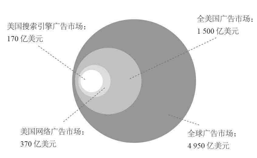 但是假设谷歌刚开始是一家广告公司,那情形就不同了。美国搜索引擎广告市场的规模是每年170亿美元,网络广告是每年370亿美元。整个美国广告市场是1 500亿美元,而全球达到了4 950亿美元。所以即使谷歌完全垄断了美国搜索引擎广告市场,也只占全球的3.4%。从这个角度来说,谷歌只是这场竞技赛中一名不起眼的小卒。