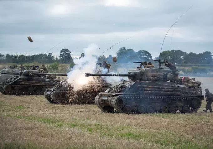 ▲四辆谢尔曼坦克在面对德军反坦克炮轰击时排成一字长蛇阵迎战。显得场面十分大气。