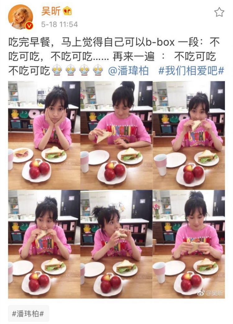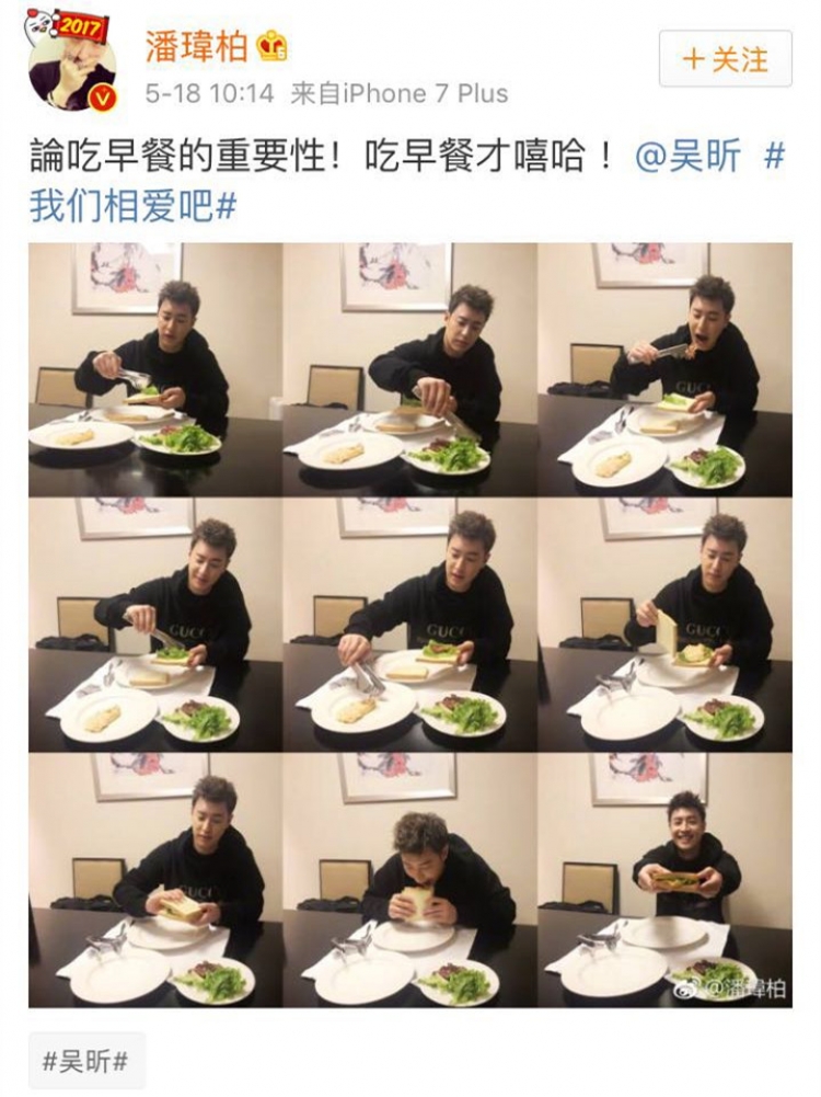 先是潘玮柏发了一条微博,内容是论吃早餐的重要性,还明晃晃地圈了吴昕!