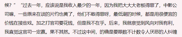 “过去一年,应该说是我收入最少的一年,因为我把大老板得罪了,中影公司嘛,一些原来在谈的片约也黄了,他们不敢得罪呀,最低潮的时候,都是用很便宜的价钱在接些戏。”