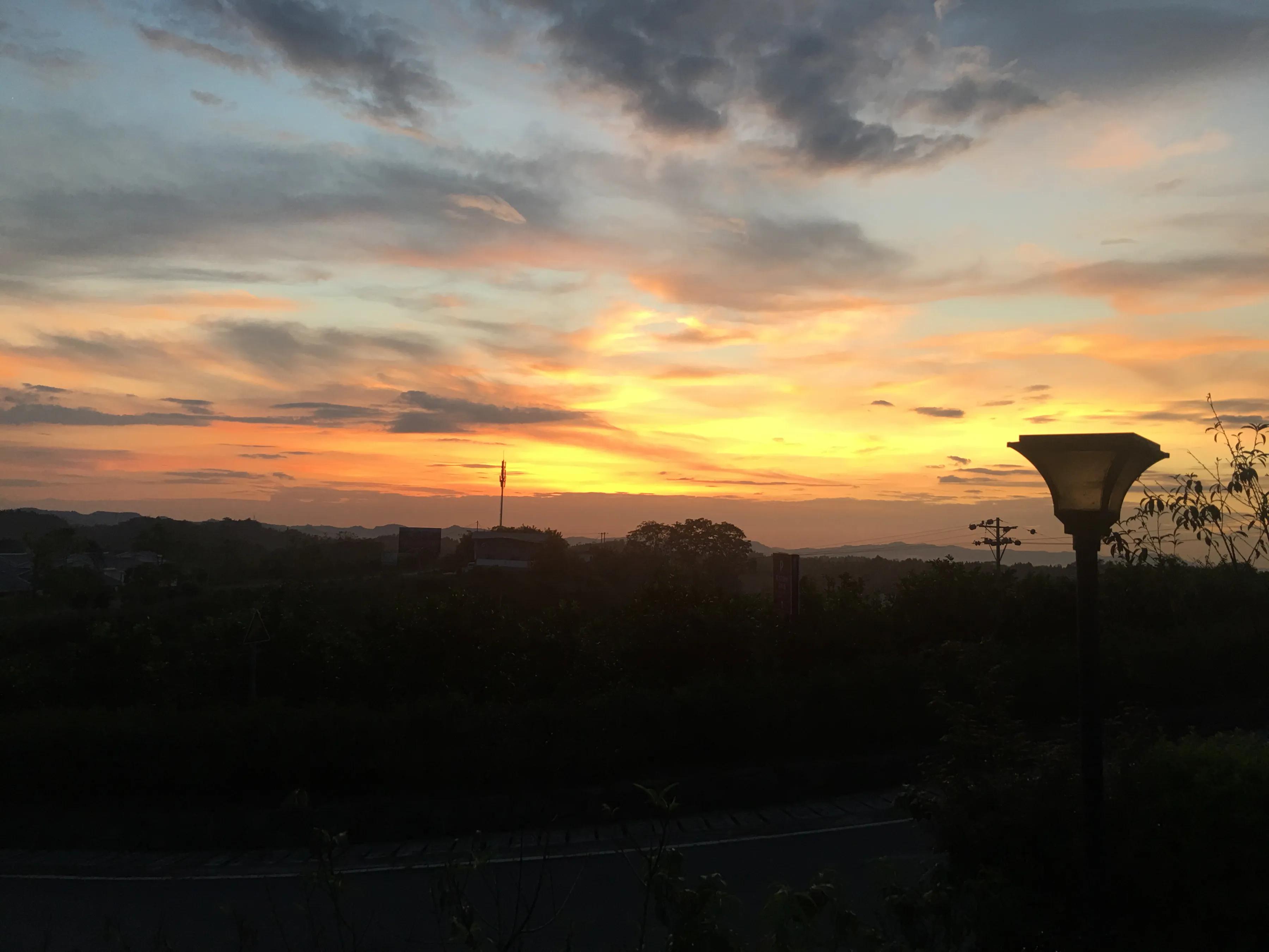 我在日晷图四周走走看看,一抬头,天上的锦绣已变成青色布缎,最远处,升起的袅袅白雾像是画了一个圆圈。这天地,仿佛荡起了一层层涟漪,我们正在涟漪之中。我手扶栏杆,看山下的农作物被夜色一点点的包裹着,偶尔从农家里冒出一星灯火,蟋蟀、知了、青蛙也在这时雀跃起来了,尽情的演唱,似要获得晚风的称赞。