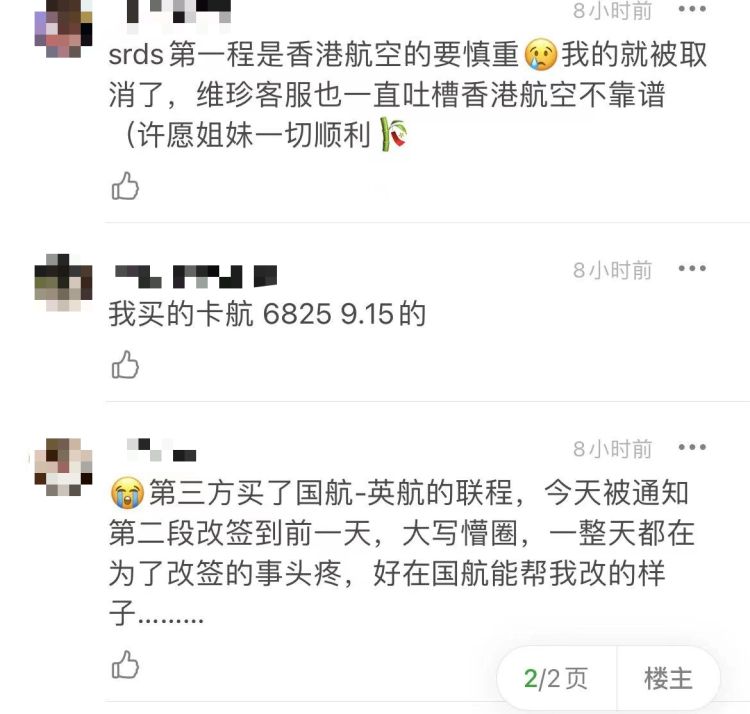 小安发的贴子下的评论,不止一人的航班被临时取消或调整了。 / 受访者供图