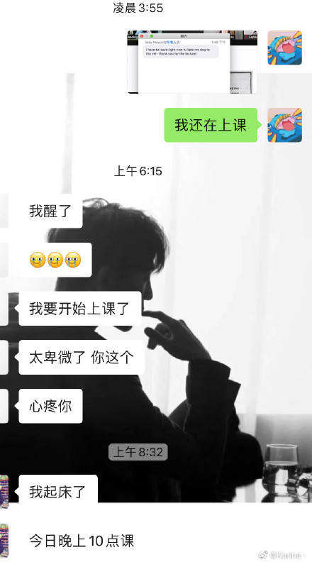一边吐槽,一边乖乖爬起来上课。/微博@karine.