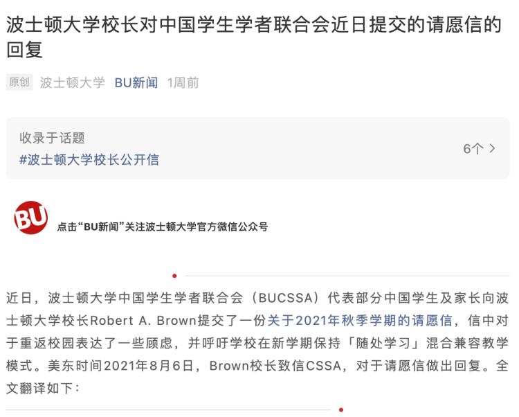 波士顿大学校长在收到留学生的联名网课申请后回复:“学校无法将每一门课都以线上的形式教授,因此线下课程是必需的。对于大家所担心的疫情,学校也已经做好了全方位的应对措施。机票和疫情的现状,学校表示理解,但还是希望大家可以尽快回到校园。”