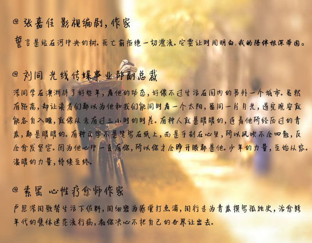 卢思浩,英文名kevin,生日:1 - 12 ,星座:摩 羯 座。独立写手。如果你愿意,记住我的名字,我叫卢思浩。是个幼稚鬼,是个做大梦的傻子,是个笃信自己未来的人,是个能为一点微小的事情开心一整天的人,是个能在城市里迷路的路痴,是个妄想留住时间跟时间赛跑的人,是个熬夜控,是个妄想用不多的文字照亮这个孤单宇宙的人,是个喜欢先说大话然后去拼命实现它的傻瓜。