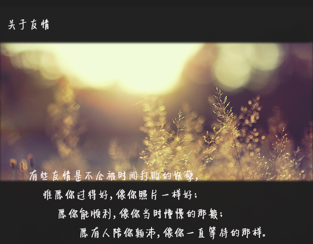 有些友情是不会被时间打败的妖孽,但即便如此我们都不再像从前一样能时刻陪伴时常联系。惟愿你过得好,像你照片一样好;愿你能顺利,像你当时憧憬的那般;愿有人陪你颠沛,像你一直等待的那样。来日相聚,再把当时的傻逼事儿和回忆下酒。