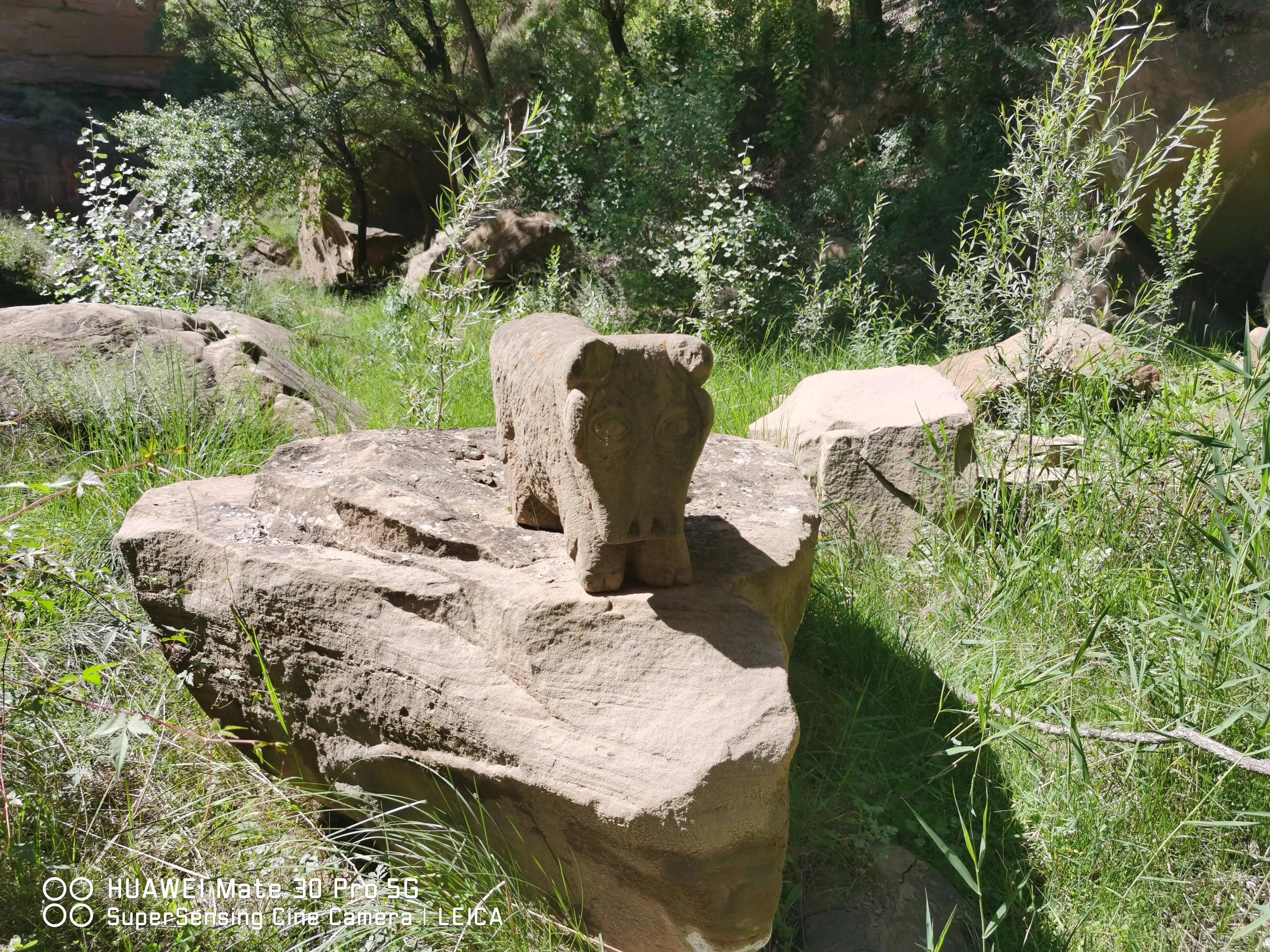 我发现草丛中有几尊看似汉代的石兽,有牛、狮、龙等造型。冯主任说是他从周边搜集来的,安置在这里供游人欣赏。走在前边的晚报记者任君宁,突然发现水沟里有水蛇游走,提醒大家小心。等我赶来瞧稀奇,早没了踪影。子长摄影家汪玉平入住这儿的文创基地,拍了许多狄青山、黄米山、重耳谷及黄土风情的大片,很有视觉冲击力和艺术感染力,这次也算半个主人,随采风团拍照取景。