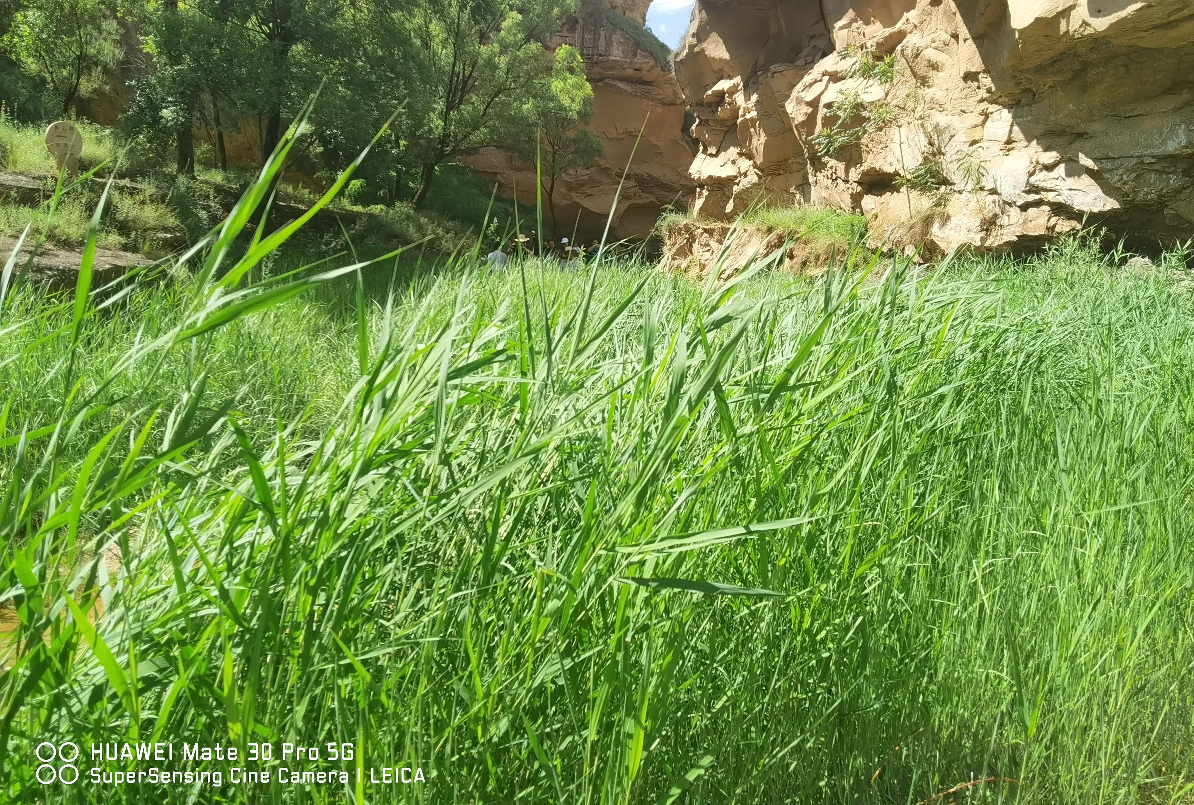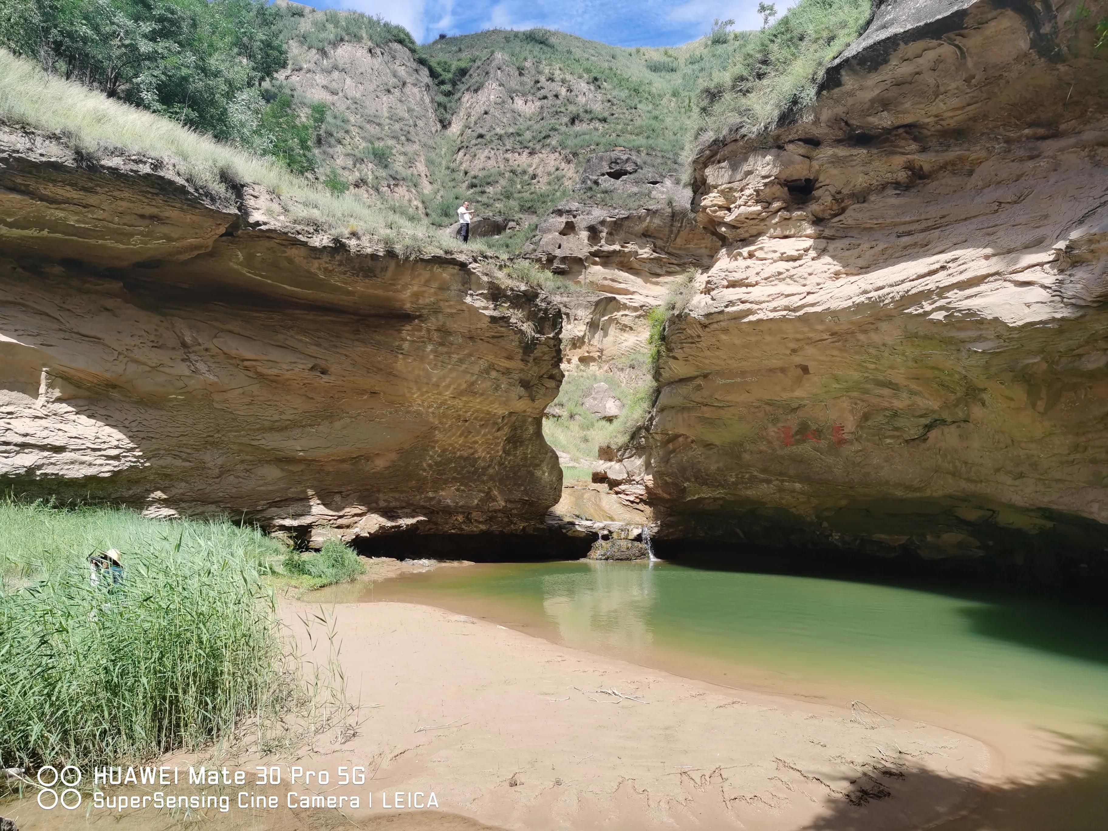 再往前便到峡谷尽头,约180度的孤形崖壁挡住去路,对面山岔涌出涓涓清泉跌入半圆形的深潭,水平如镜、清凉幽静。左岸竟生出成片掩人的芦苇,蒹葭葳蕤、随风摇曳,仿佛使人步入江南水乡。原来这黄土高原深处,还隐秘如此婉约俊秀、流连忘返的美景雅致。怨不得重耳一住12年,喝着小米粥、嚼着洋芋擦擦,乐不思蜀呢?
