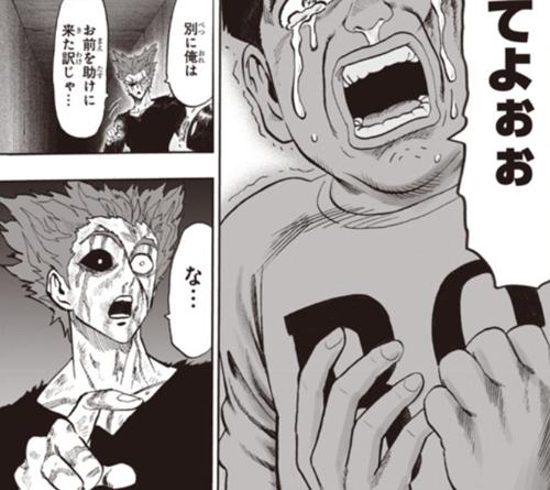 出门口就遇到了杂兵,顺手秒掉之后就直接开吃了,对于能找到这里的原因饿狼回答的很明确,因为他是怪人,这很明显是饿狼开始怪人化的征兆了,不仅仅是超强的自我治愈能力而且为了补充能量而不择手段,相对于原作来说这里的饿狼怪人化过程更加的明显,因为已经开始食用,外加用怪人的物件来止血等等,饿狼的身体内部应该已经发生了异变了,然而这类应该还缺乏一个契机。