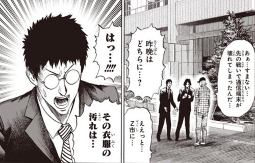 king帮埼玉扔完垃圾打算回家休息,在路上考虑了一下z市不禁背脊发凉,也就老师这样的实力派人士才敢住在这种怪人经常出没的地方,刚回到家门口就发现英雄协会的相关工作人员在等他。本来是沾到衣服上的火锅污渍被这俩哥们以为是king连夜出去战斗了,这个神误会简直了。