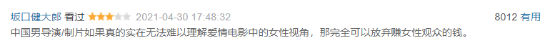 “中国男导演/制片,如果真的实在无法理解爱情电影中的女性视角,那完全可以放弃赚女性观众的钱。”