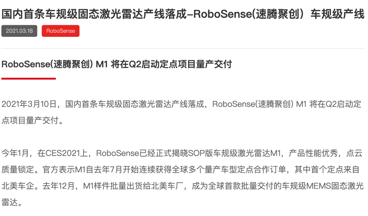 从robosense官方网站上的新闻资料中可知,其实早在今年1月的ces2021上,robosense已经正式揭晓sop版车规级激光雷达m1。而在去年12月,m1样件已经批量出货给北美车厂。据说这家北美车厂就是lucid motor,它的首款车型lucid air将搭载这款m1激光雷达,并将于下半年交付。