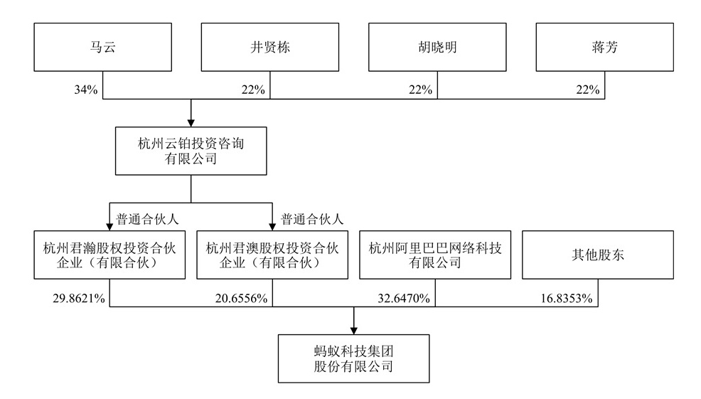 基于杭州云铂、杭州君瀚、杭州君澳的股权安排,马云能够间接控制蚂蚁集团50.5177%股份,成为蚂蚁集团的实际控制人。