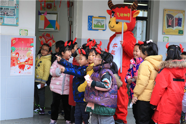 在“适合教育”理念的引导下,一年级的各位老师一直在追求用合适的目标、用适合儿童发展的“正评价”鼓励、帮助刚从幼儿园迈入小学的娃娃们“正成长”。因此,学校打破传统“一纸一笔唯分数”的测评方式,抓住即将到来的春节这一节日氛围,策划了“小牛向前冲”期末大闯关主题活动,把学科知识综合融合在牛年喜气洋洋的过年情境之中,全方位、多维度地展示及考察学生的关键能力及必备品格。