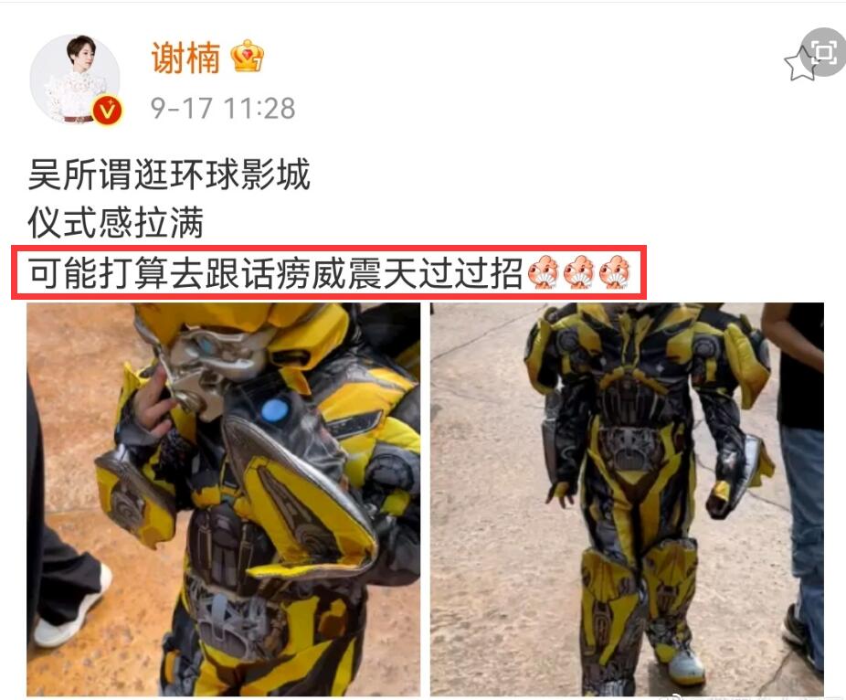 吴京的儿子吴所谓仪式感就非常满了,根据他的妈妈发布的博文来看,吴所谓这一次出现在北京环球影城,是以大黄蜂的形象出现的,回头率100%。看来有硬汉父亲吴京,儿子也遗传的这方面的基因,非常喜欢生猛的形象。