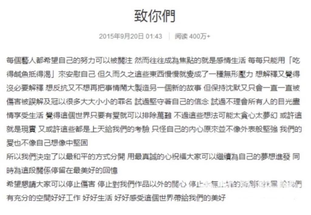 2015年9月20日,陈伟霆发文《致你们》,表明已经与蔡卓妍分手,并希望“大家可以停止伤害,停止对我们作品以外的关心,停止永无止境的猜测和抺黑”。