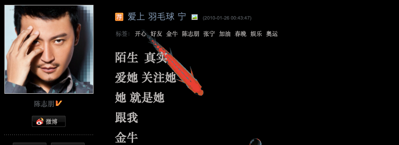陈志朋最近一次的恋情传闻,还要追溯到2010年的博客时代。起因是他在自己的博客上晒出一张羽坛名将张宁的照片,并写有一篇《爱上 羽毛球 宁》的博文: