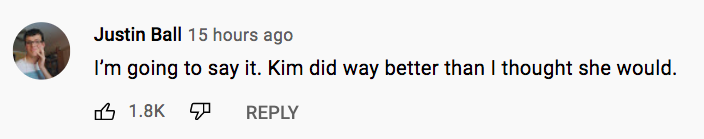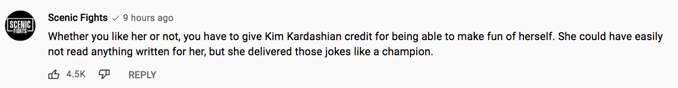 有人这么说:“不管你喜欢她与否,还是要认可金·卡戴珊能自我调侃这件事。她完全可以不读编剧为她写的东西,但她完全不怕这些笑话诶。”