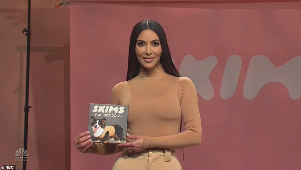 金姐不仅调侃大姐和前夫侃爷,在《skims commercial skims广告》这个植入自家品牌的桥段里,还欣然接受被编剧吐槽她过度追求身体曲线,疯狂到给狗出塑身衣,连胖狗子都不放过(节目效果啦~)。