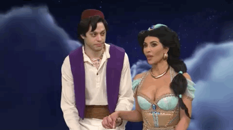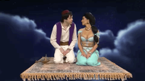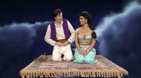在《茉莉和阿拉丁》的小品里,金姐扮演茉莉公主,和皮特·戴维森扮演的阿拉丁坐着飞毯谈情说爱。阿拉丁一说话就开车,说怕自己“表现不好”,所以把精灵叫出来许愿。