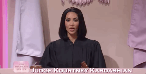 另一个小品《the people’s kourt人民法院》,金姐直接大姐考特妮上身,模仿她的加州冷漠腔调和造型当法官。