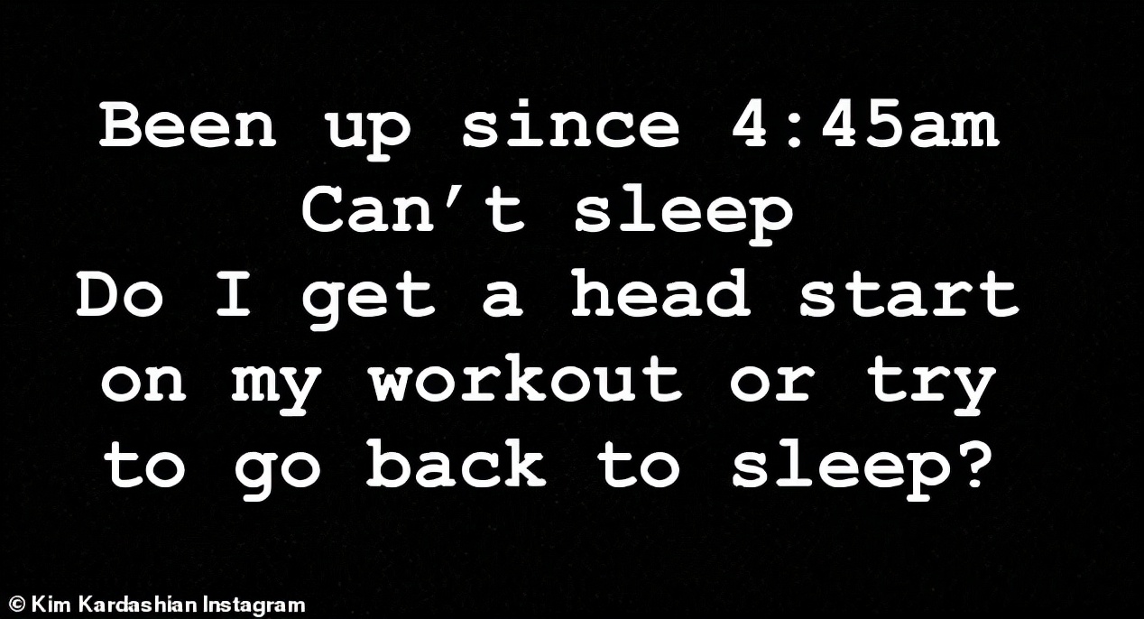 去年九月份的一天,金卡戴珊凌晨在ins故事里分享了一条黑白文字帖子,写着“凌晨4点45分就起床了,睡不着,我是先开始锻炼呢,还是试着回去睡个回笼觉?”