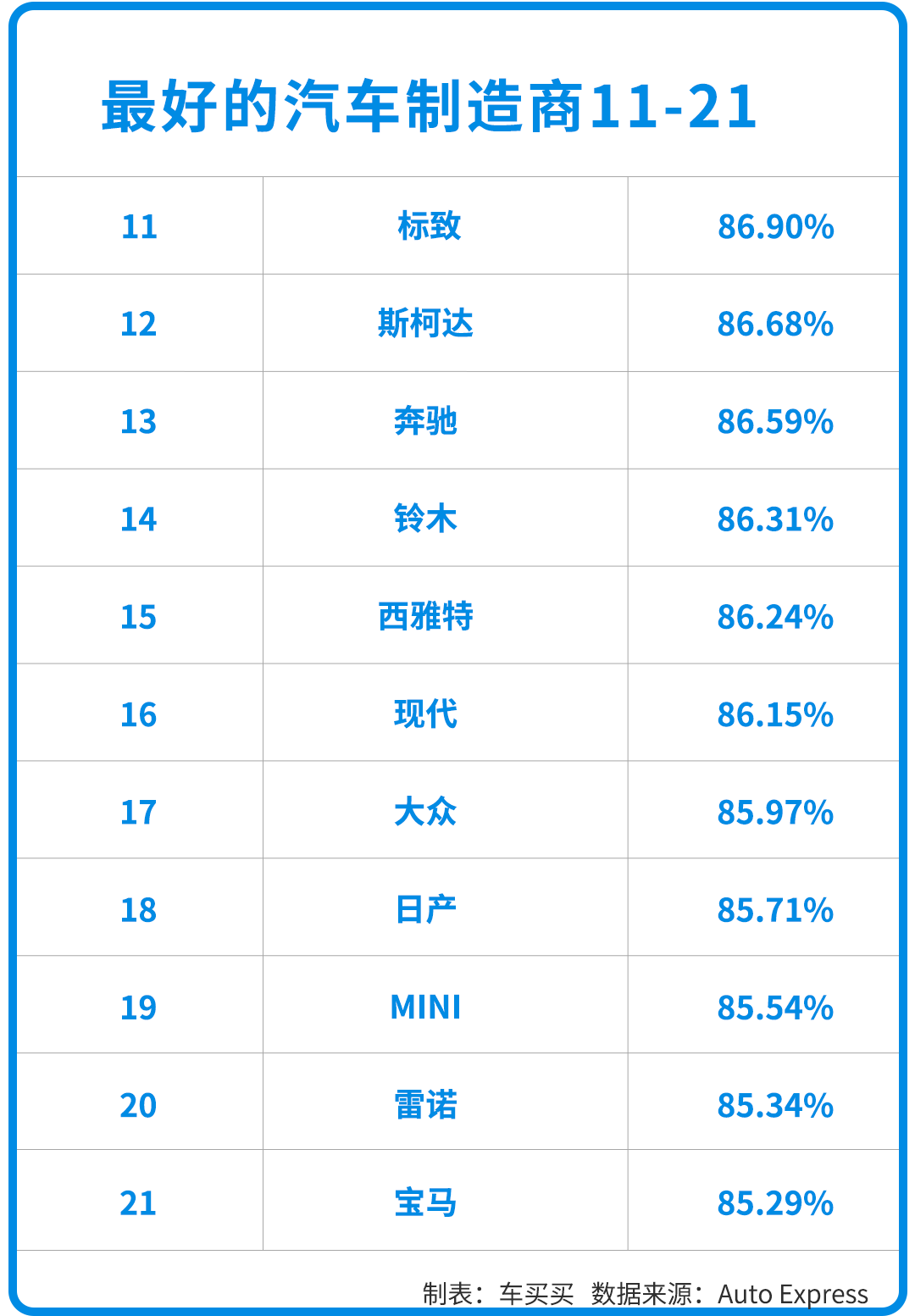 虽然有些争议性很大的汽车品牌也在榜上,但总的来说,每个品牌优越点分明,无论是真实车主的言论还是英国媒体的评论都非常客观,根据实际评分情况进行排名,对于国内消费者选买车还是有一定的参考意义的。