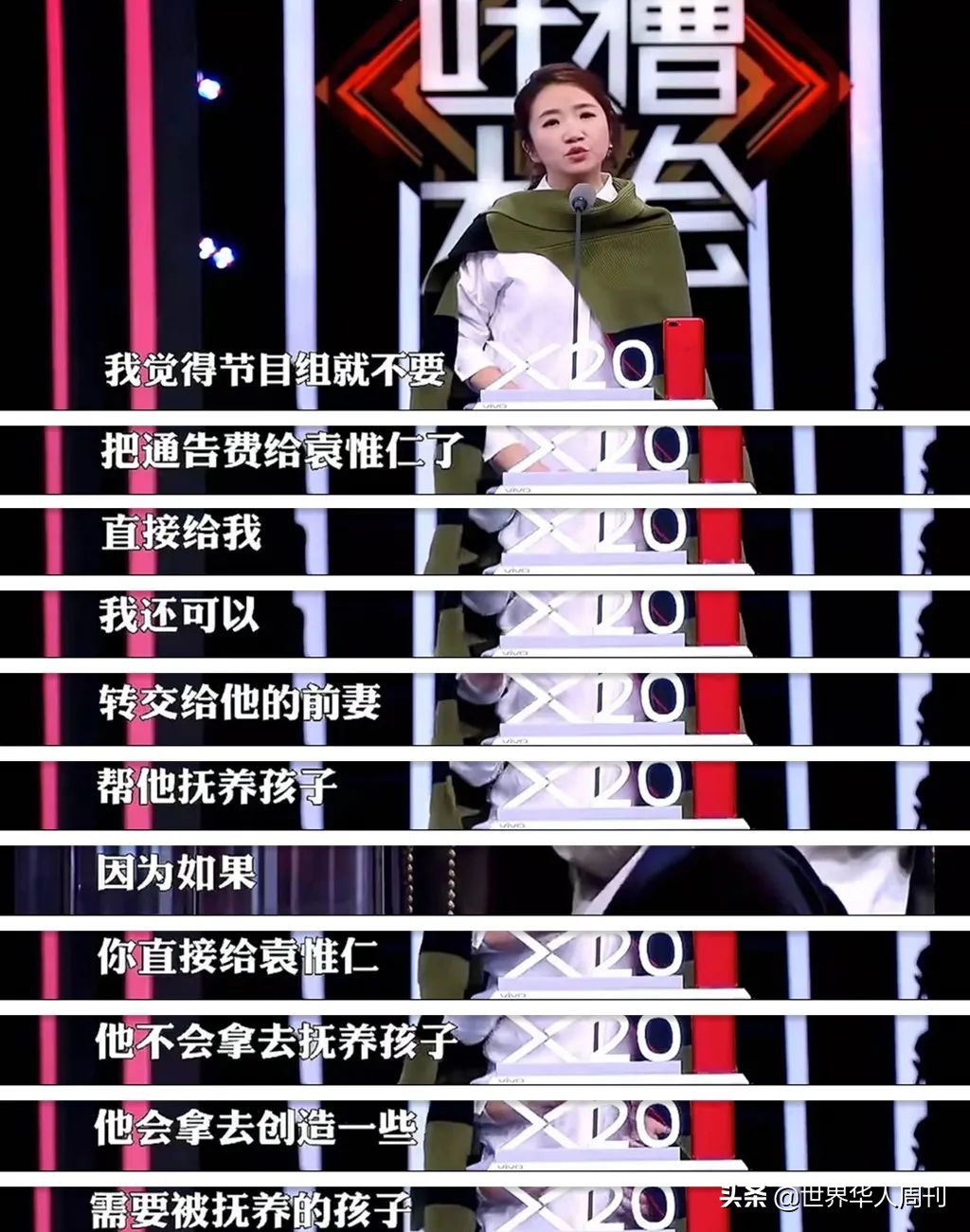 “我觉得节目组就不要把通告费给袁惟仁了,直接给我,我还可以转交给他的前妻,帮他抚养孩子。因为如果你直接给袁惟仁,他不会拿去抚养孩子,只会拿去创造一些需要被抚养的孩子。”