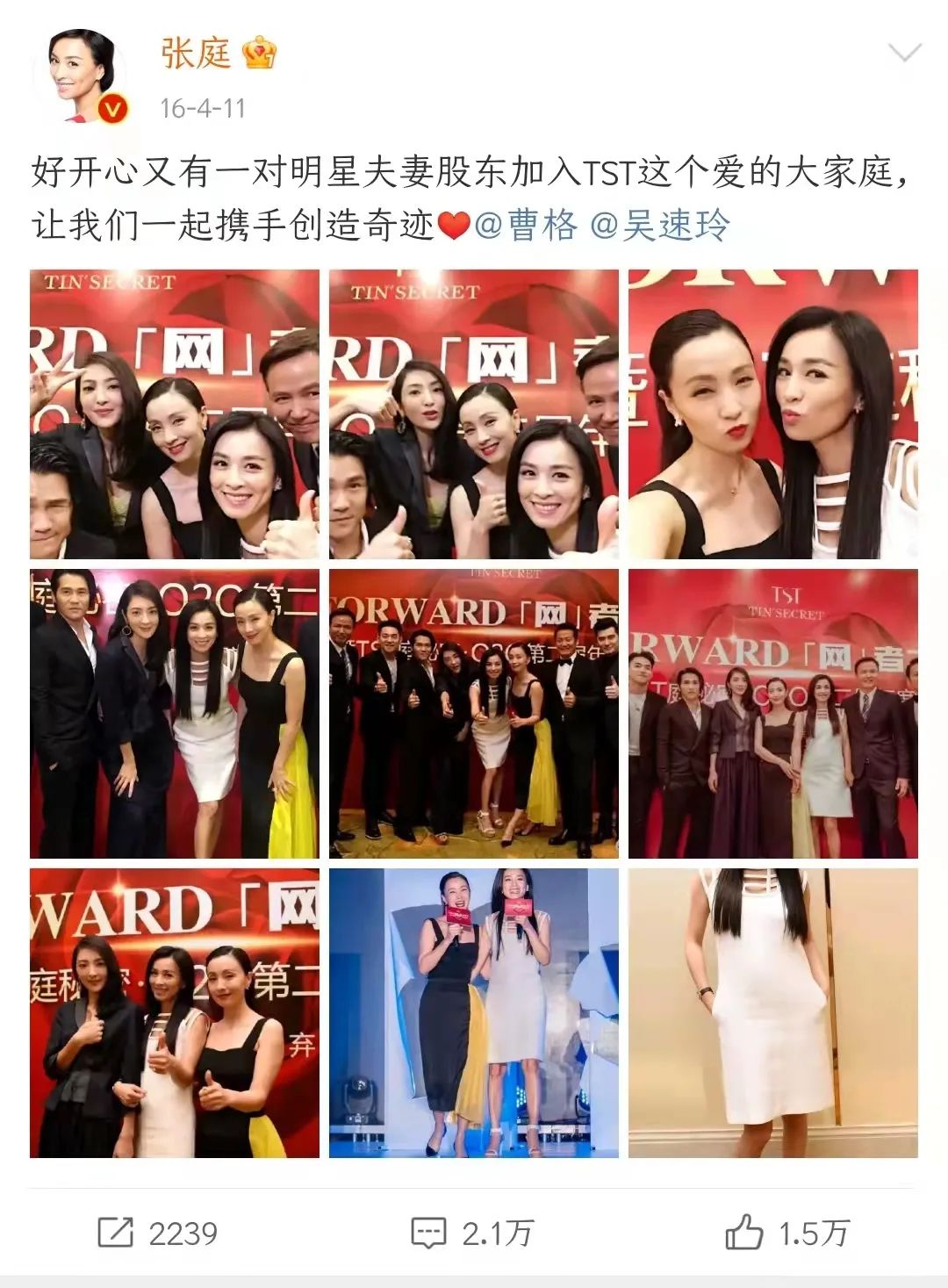 此外,2016年4月11日,张庭也曾微博官宣曹格、吴速玲夫妇成为股东。明道也于2020年年末传出加盟张庭微商公司,二者之间的互动也相对亲密。