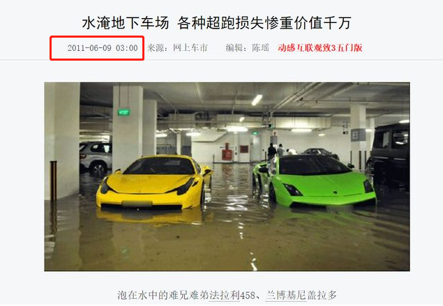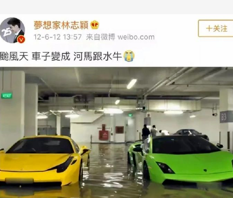 2012年,他发了两张跑车被水浸泡的图,还配了大哭的表情。
