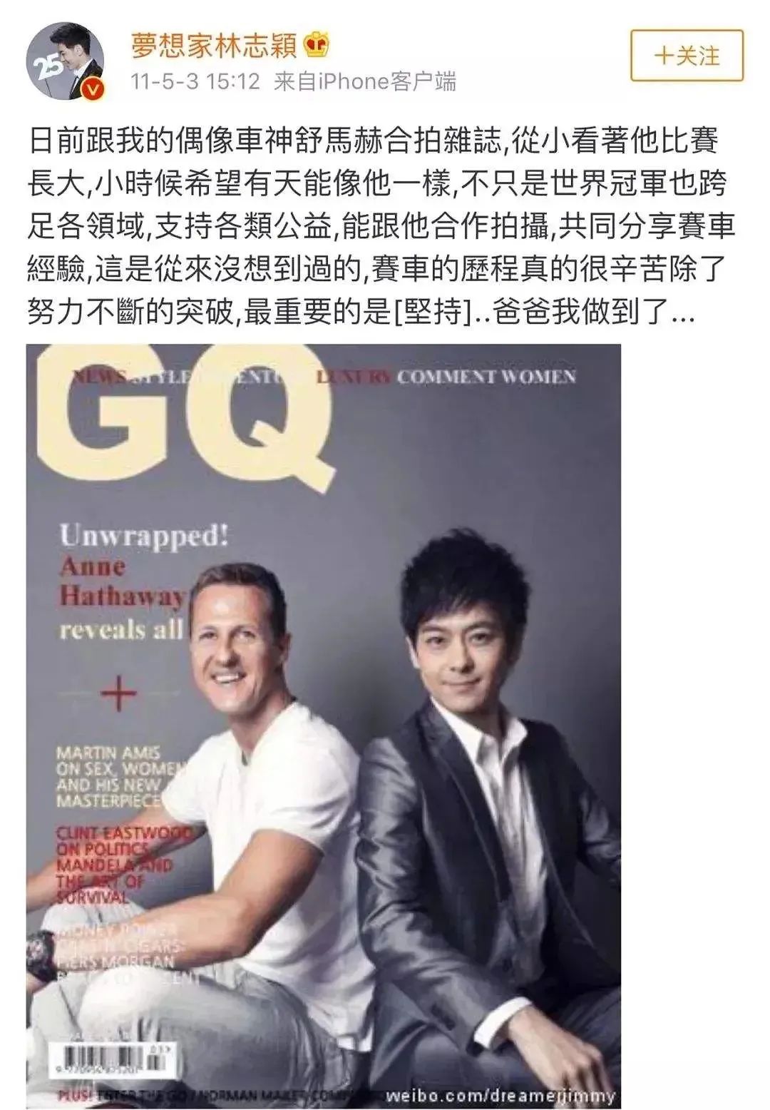 比如,2011年,他晒出了一张和车神舒马赫的杂志封面。