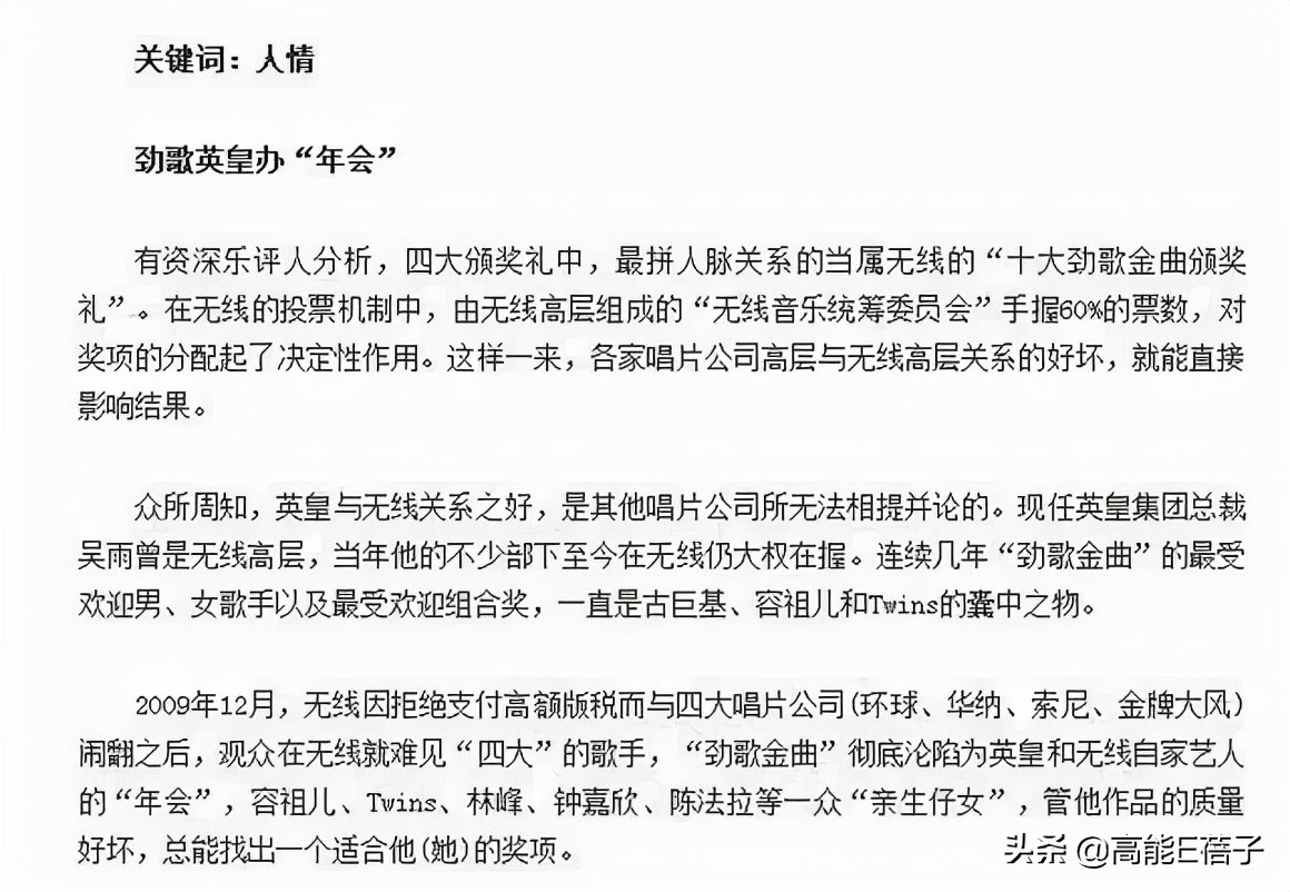 有资深乐评人分析,四大颁奖礼中,最拼人脉关系的当属无线的“十大劲歌金曲颁奖礼”。在无线的投票机制中,由无线高层组成的“无线音乐统筹委员会”手握60%的票数,对奖项的分配起了决定性作用。各家唱片公司高层与无线高层关系的好坏,或许能影响结果。