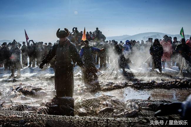 机器声隆隆,可以看出各种鲜鱼开始跳跃冰面,随着渔网将鱼缓缓带出冰面,群鱼欢腾,随即冻住,场面壮绝。
