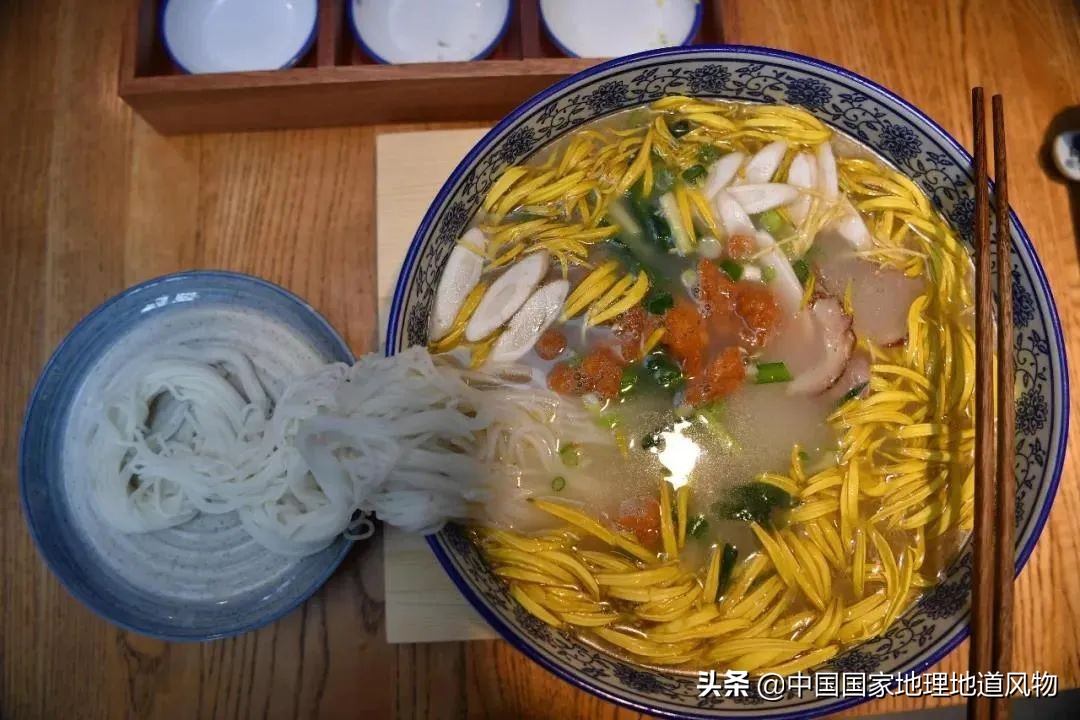 在“帽子”繁多的云南米线中,最有名的当属蒙自的过桥米线了。大碗鸡汤上飘着金黄的菊花瓣,菊花的清香融入到鸡汤的醇厚中,让人食欲大增。