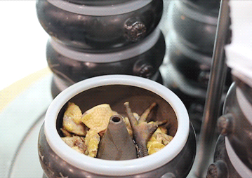 “汽”一个小时后揭开锅盖,鸡肉实现了华丽转身,清冽又泛着金光的鸡汤静静地躺在汽锅中,鸡肉的鲜美被牢牢锁进了汤里,每一滴都是浓缩的精华。