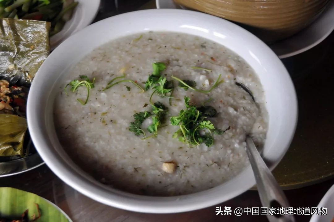 如果说鬼鸡和舂鸡脚代表了景颇人的a面——热情、火辣,那么另一道景颇美食:鸡肉稀饭则代表了景颇人的b面——温暖、细腻。炖煮乌鸡的汤作底,加入香米和鸡肉碎块文火熬煮,片刻后,鸡肉稀饭的清香便溢满了整个厨房。嚼一块酸爽的鬼鸡,喝一口温补的鸡肉稀饭,让人颇有“原汤化原食”的满足感。