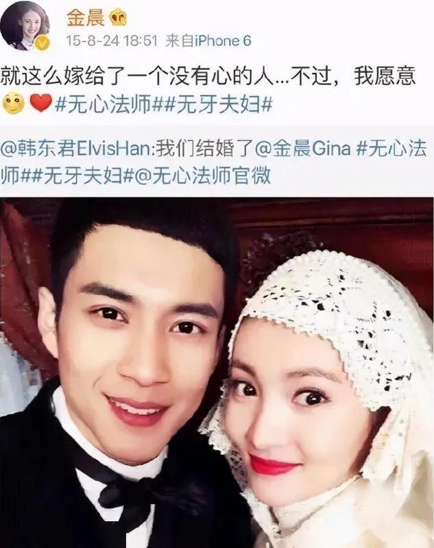 韩东君在社交平台放上两人剧照,大胆配文:我们结婚了。