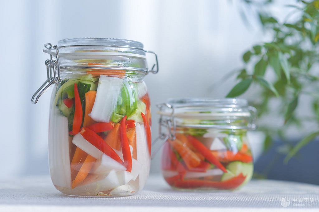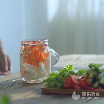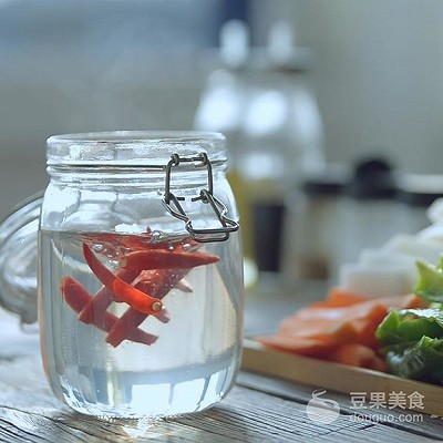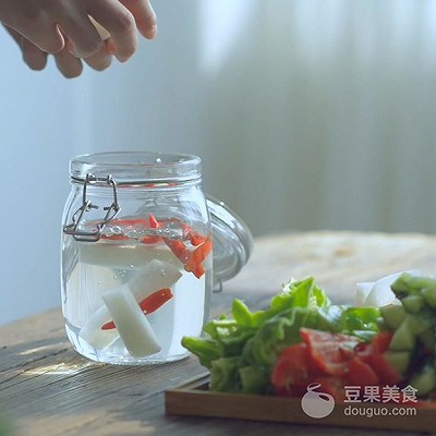 28、将晾干的蔬菜依照上图的顺序放入瓶中,先放辣椒,樱桃罗卜,两种辣椒。