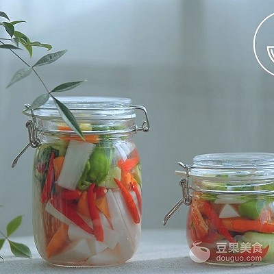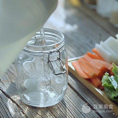 27、 将放凉后的泡菜水倒入玻璃瓶中,不要太满,然后将所有配料倒入。