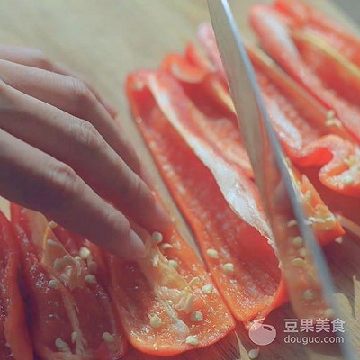 5、将红辣椒切成条状,备用。