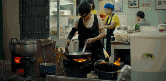 她揽起头发,带上护目镜,双臂青筋必现的开始翻腾起炒锅。就算热油崩溅在手臂上,也丝毫不能打乱她的翻炒节奏。