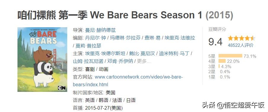 首先,初学者呢我比较推荐大家看两部动画片。一个是咱们裸熊,讲述的就是三只小熊的一个日常生活。一集只有十分钟的时间,特别适合晚上睡前观看,熊熊们又蠢又萌的生活。带给你无限的心理治愈。整部剧的单词都很简单,关掉字幕你也能听懂里面讲了什么,非常适合初中及以下英语水平的同学观看,完全无压力。