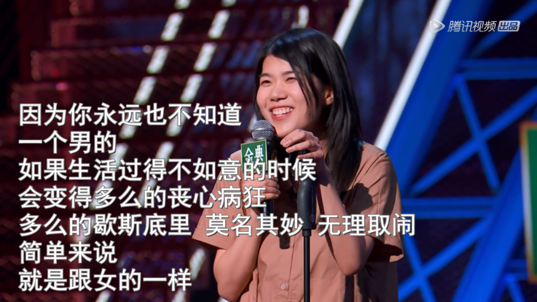 注意,上一句“跟男的一样”,是我为男同胞们做出的犀利反击——因为杨笠在《脱口秀反跨年》里有句被消音的话:“男的,垃圾。”
