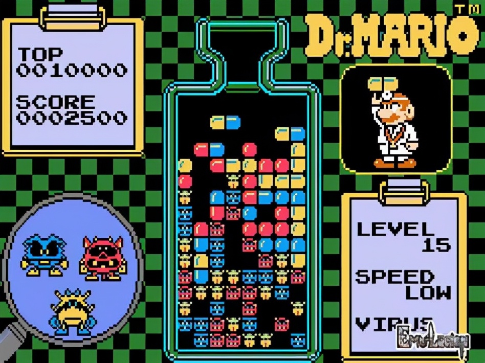 可能也正因如此,九十年代初的消除类游戏虽然竞争激烈,但其画风可都是相当正常且脉络清晰的:在隔壁fc的《马里奥医生》里,马里奥不在单恋公主一人,而是开起了诊所,用源源不断的药丸与病毒构成相同配色,以此消灭病毒悬壶济世,其具体表现使得游戏基本上可以被看成是《俄罗斯方块》特化版本,由此诞生的《噗呦噗呦》(puyo puyo)和《世界饲育系选手权》(baku baku animal)也都完美延续了俄罗斯方块的益智属性,并没有(也没必要)突破其框架呈现些更标新立异的内容;