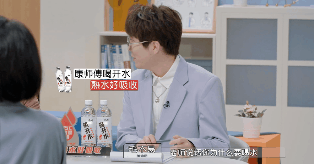 有一次,大家讨论“新人在饭桌上能不能先于领导吃饭”,周深刚好在易立竞讲话的间歇喝了口水……毛毛就开始演了:“老师说话你为什么喝水?”