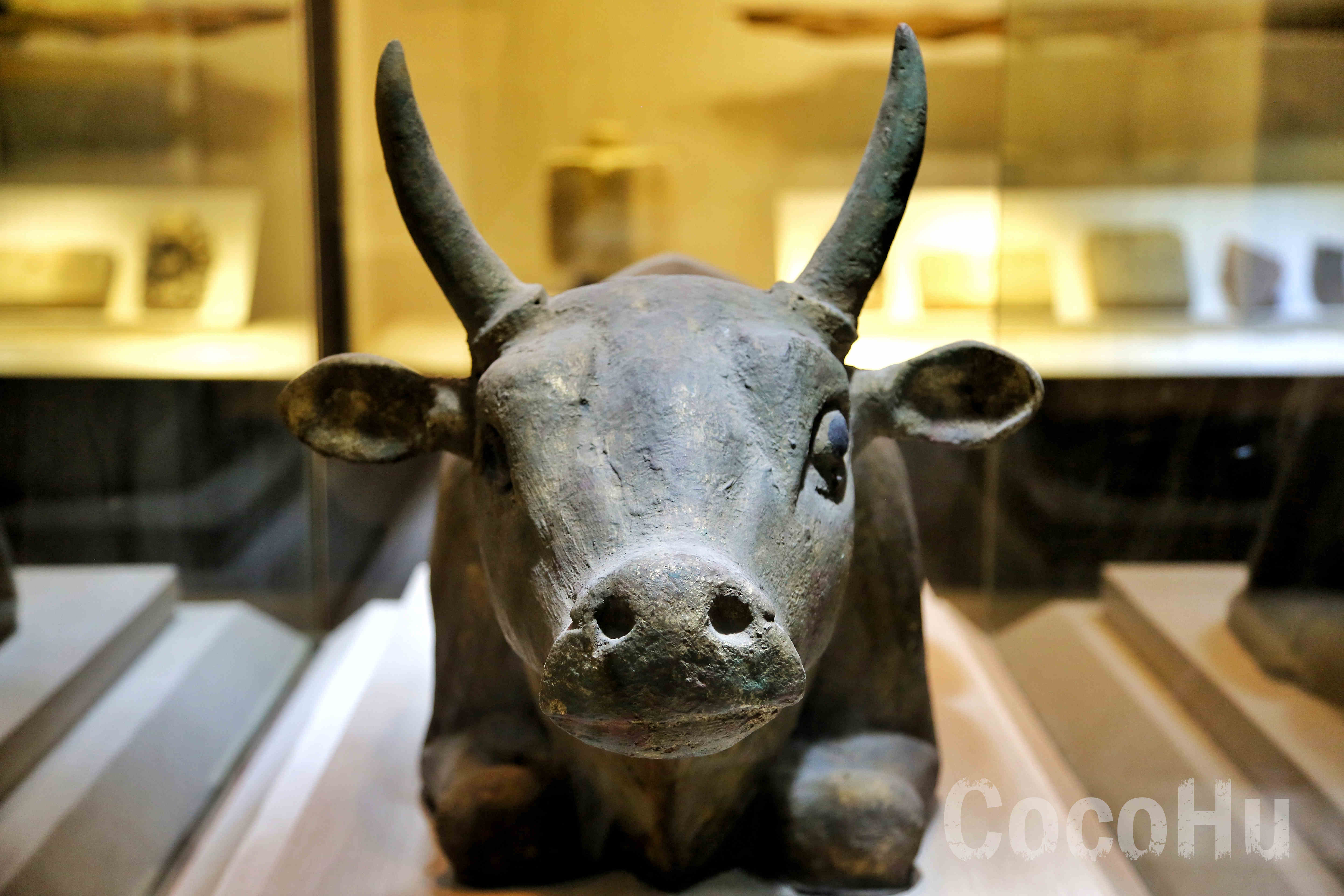 在第177号陪葬墓的墓室中,出土有鎏金铜牛、 铁狗等金属制品,还有石马等石雕。其中这件鎏金铜牛,算是镇馆之宝,其神态活灵活现,经年累月依然神采奕奕。